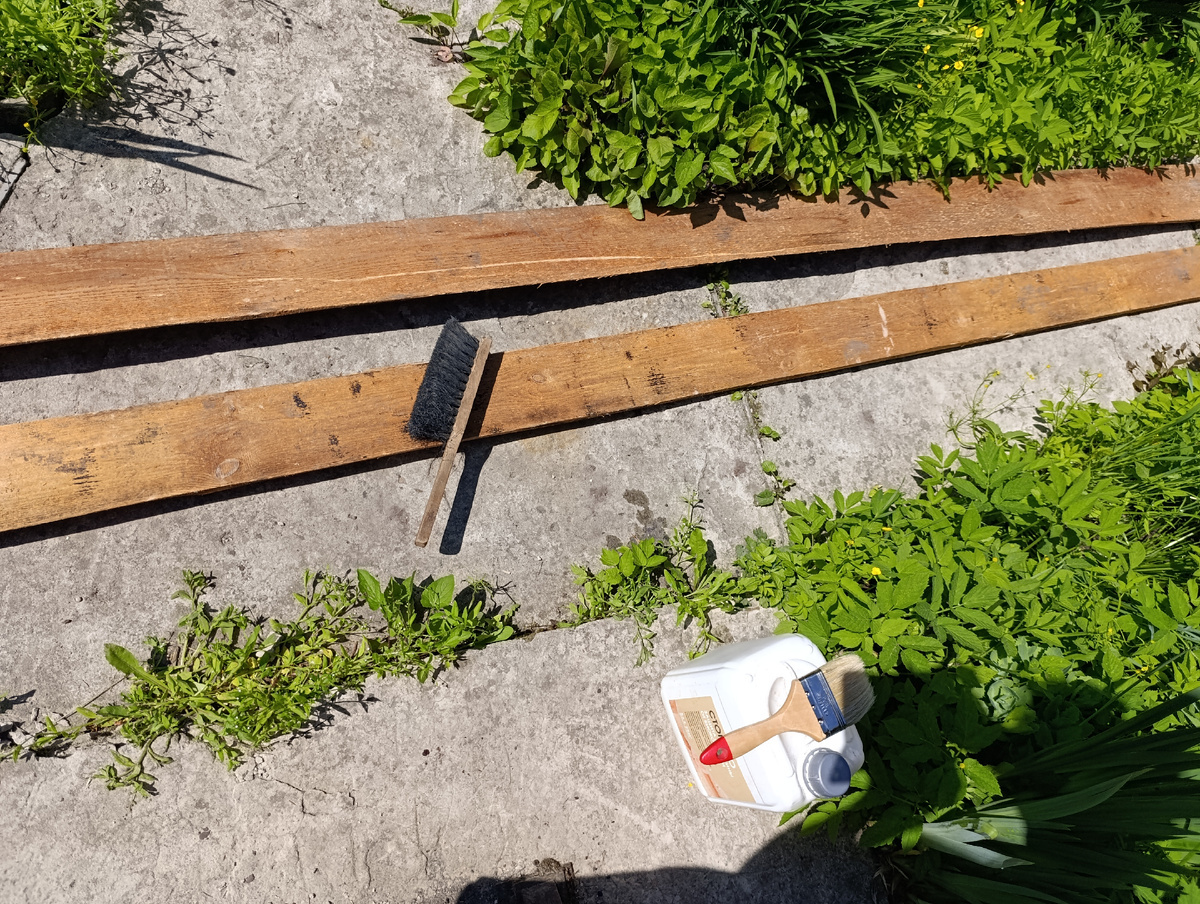 Для защиты от гниения применяется биозащитное покрытие. Нож и ножовка используются для удобного подреза и формирования углов, особенно там, где деревянные поверхности требуют более тонкой обработки.