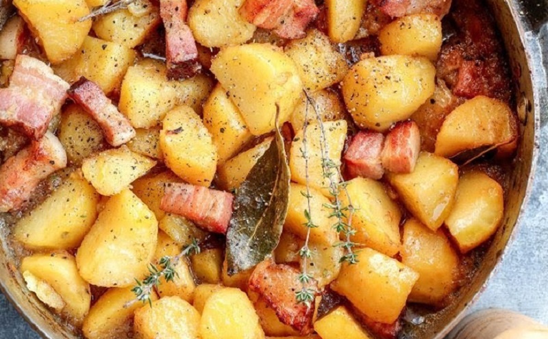 5. Влить бульон или вино, чтобы собрать прижаренные кусочки со дна, и вернуть в сотейник лук с беконом, добавить лавровые листья. Накрыть крышкой и поставить в разогретую до 180°C духовку на 35-40 минут, пока картофель не станет мягким.