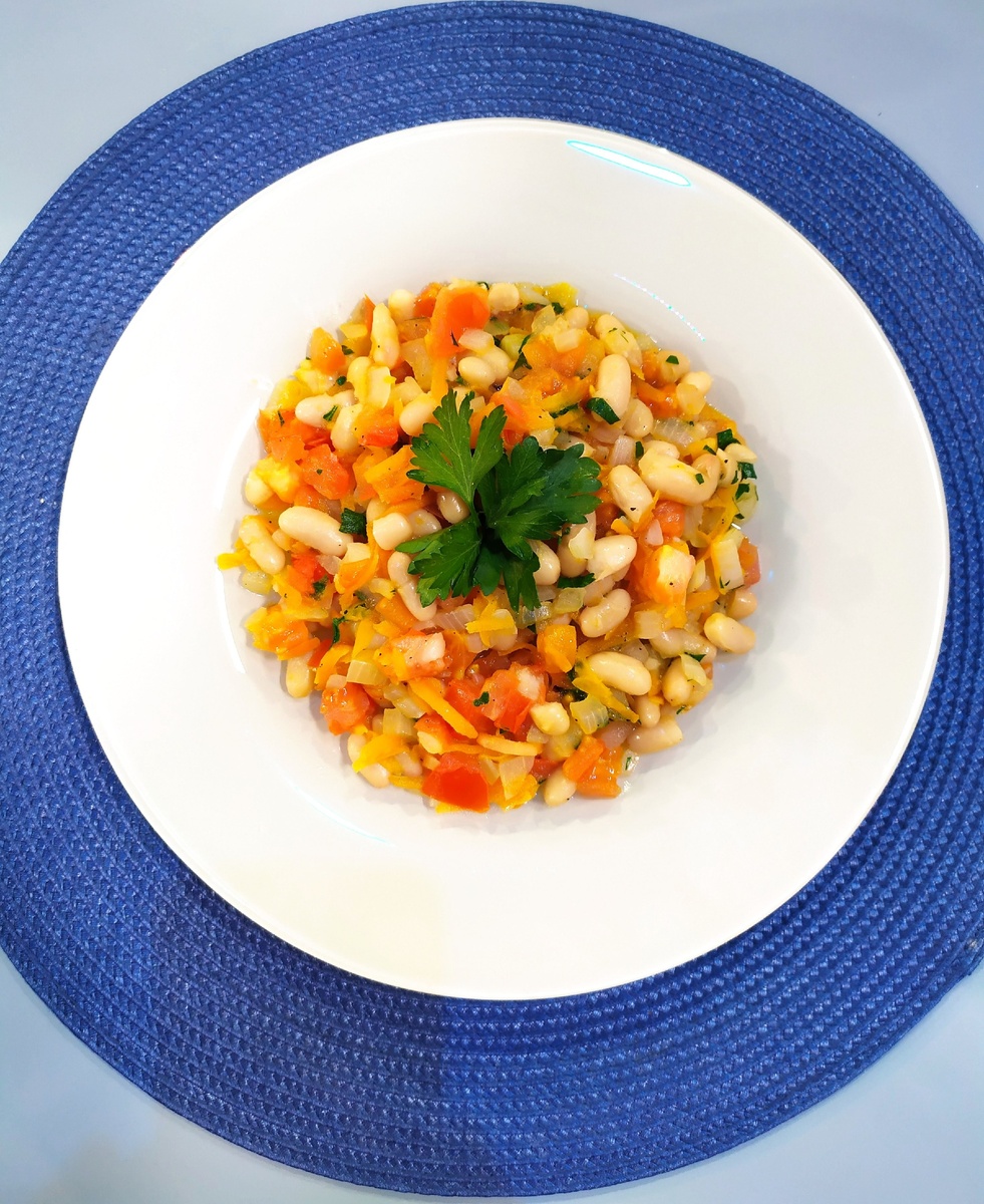 3. По завершении обжаривания добавьте фасоль, тщательно перемешайте и готовьте еще несколько минут. Посолите, поперчите и добавьте свежую зелень перед подачей на стол.