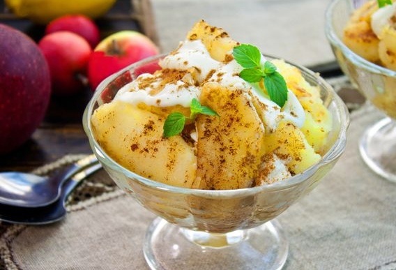 3. Перекладываем готовые яблоки на блюдо, посыпаем сахаром и поливаем лимонным соком. Разложите порции по креманкам: сверху добавьте сливочный сыр и щепотку корицы для аромата.