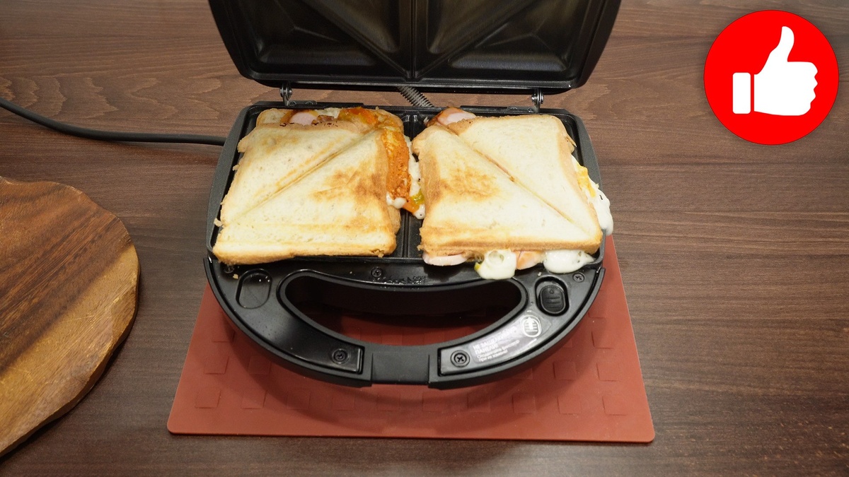 Далее, в разогретую минипекарню помещают бутерброды сыром вниз. Время приготовления составляет всего три минуты. После завершения приготовления бутерброды нужно аккуратно разрезать, и они готовы к подаче!