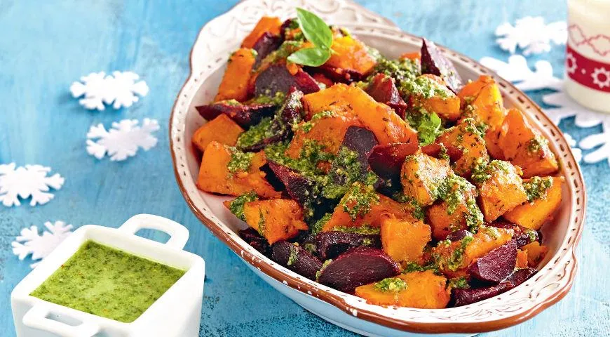 Печеная тыква и свекла – это не только вкусно, но и полезно. Эти овощи богаты витаминами, способствуют укреплению иммунитета и поддерживают здоровье сердечно-сосудистой системы. Песто добавляет дополнительную ценность, обогащая блюдо полезными жирами и антиоксидантами.