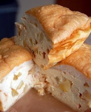 Подготовка основы: Начать с отделения белков от желтков. Желтки взбить с небольшим количеством молока до получения однородной массы, затем добавить творог и снова тщательно взбить. Грушу или банан нарезать небольшими кусочками вместе с зефиром и добавить к творожной смеси.