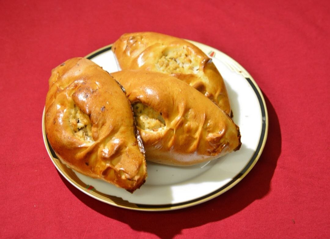 Пока тесто поднимается, готовим начинку: отварить картошку, размять, а грузди нарезать. Смешать и приправить. После поднятия теста его следует обмять, формировать небольшие шарики, а затем раскатать в овальные лепешки. Наполнить начинкой, защипнуть край и оставить расстояться. Перед выпечкой смазать и выпекать 15-20 минут при 180-200°C. Подавайте с ароматным грибным бульоном.