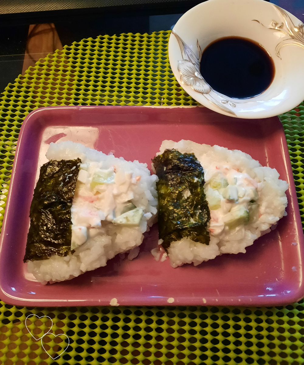 Параллельно с приготовлением риса стоит заняться начинкой, мелко нарезав крабовые палочки и огурец. Затем, смешав их с майонезом и творожным сыром, можно готовить сами онигири.
