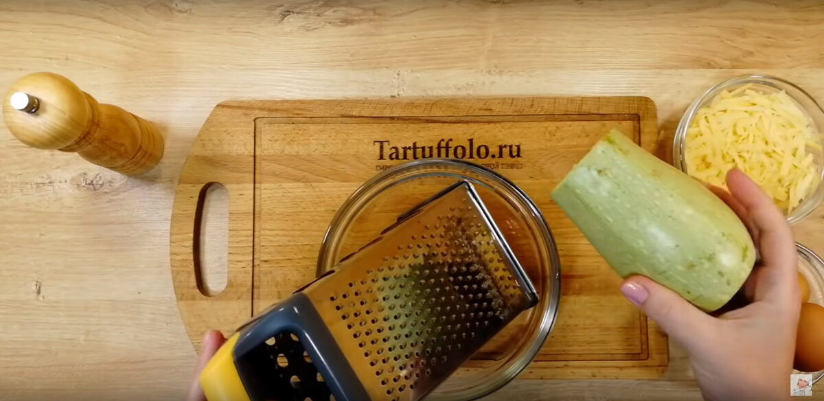 1. Начните с натирания кабачка на мелкой терке – при использовании молодого кабачка кожа не мешает, и его можно натирать целиком.