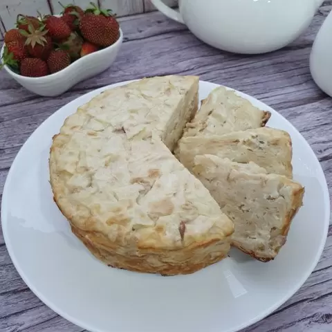 Полученную массу распределите по форме диаметром 16 см и запекайте в предварительно разогретой до 180 градусов духовке в течение 30-35 минут, до золотистой корочки. После выпекания дайте пирогу немного остыть, и затем нарежьте на порционные кусочки.