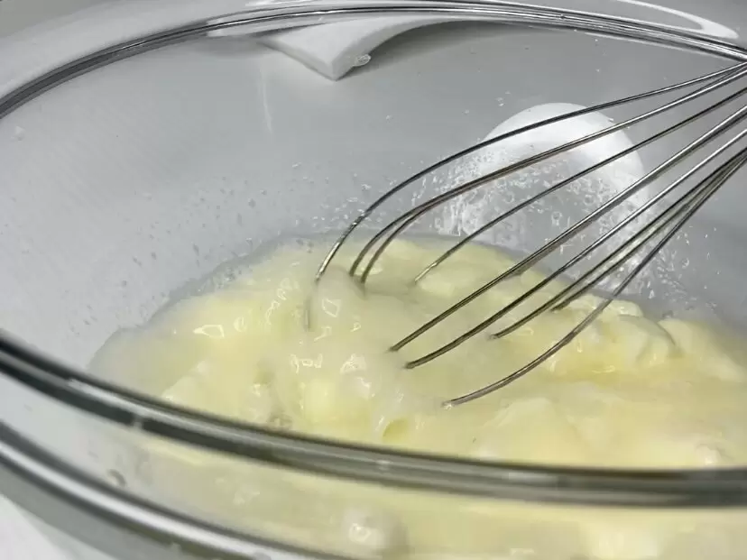 Сначала нарезать масло кубиками и положить в миску. Затем влить горячую воду и тщательно перемешать венчиком. Не стоит переживать, если масло полностью не растопится — оно прекрасно смешается в процессе замеса.