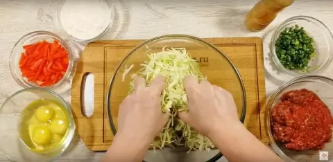 Прежде всего, капусту следует мелко нашинковать. Для этого понадобится 400 граммов, которую нужно немного посолить и помять, чтобы она стала мягкой и чуть соком выделила.