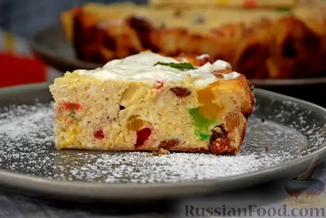 Эта запеканка готовится с добавлением манной крупы и отличается неповторимой нежностью. В процессе выпекания, благодаря взбитым белкам, она становится пышной, хотя немного оседает, остыв. Яркие цукаты и изюм придают этому десерту особое обаяние и интересный вкус.