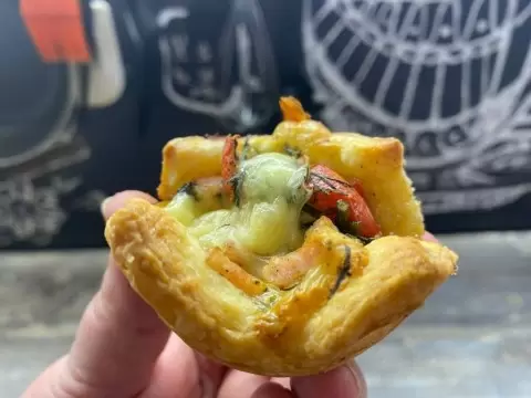 Начните с размораживания теста, слегка раскатайте его и нарежьте на квадраты со стороной около 3 см. Затем разместите их в формочках для кексов. Проколовшие дно каждого кусочка теста вилкой, подготовьте его для наполнения. Выложите выбранную начинку в тестяные корзиночки.
