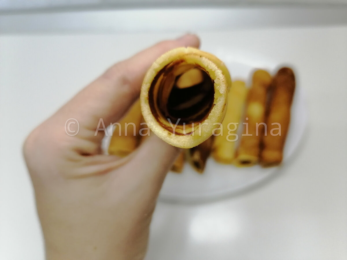 Снимая сковороду с огня, скрутите лепешку в трубочку, пока она ещё горячая. Теперь можно начинять трубочки любимым кремом или просто наслаждаться ими без начинки — они вкусны сами по себе!