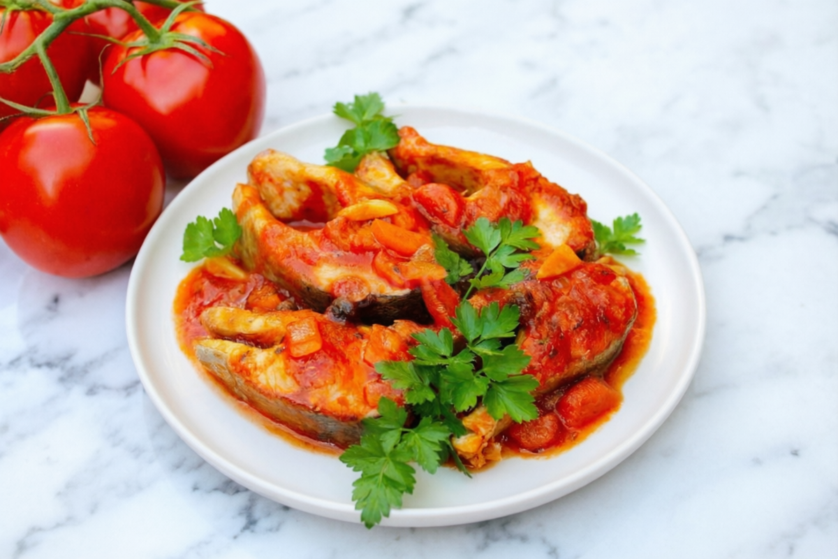 Рецепт, который не утомляет, но радует — рыба, запеченная в томатном соусе без лишних добавок. Используйте филе белой рыбы (минтай, хек или треска), свежие помидоры или томатную пасту, добавьте лук и душистые травы. Запекание в духовке делает блюдо нежным и сочным, сохраняя все ароматы без добавления масла.