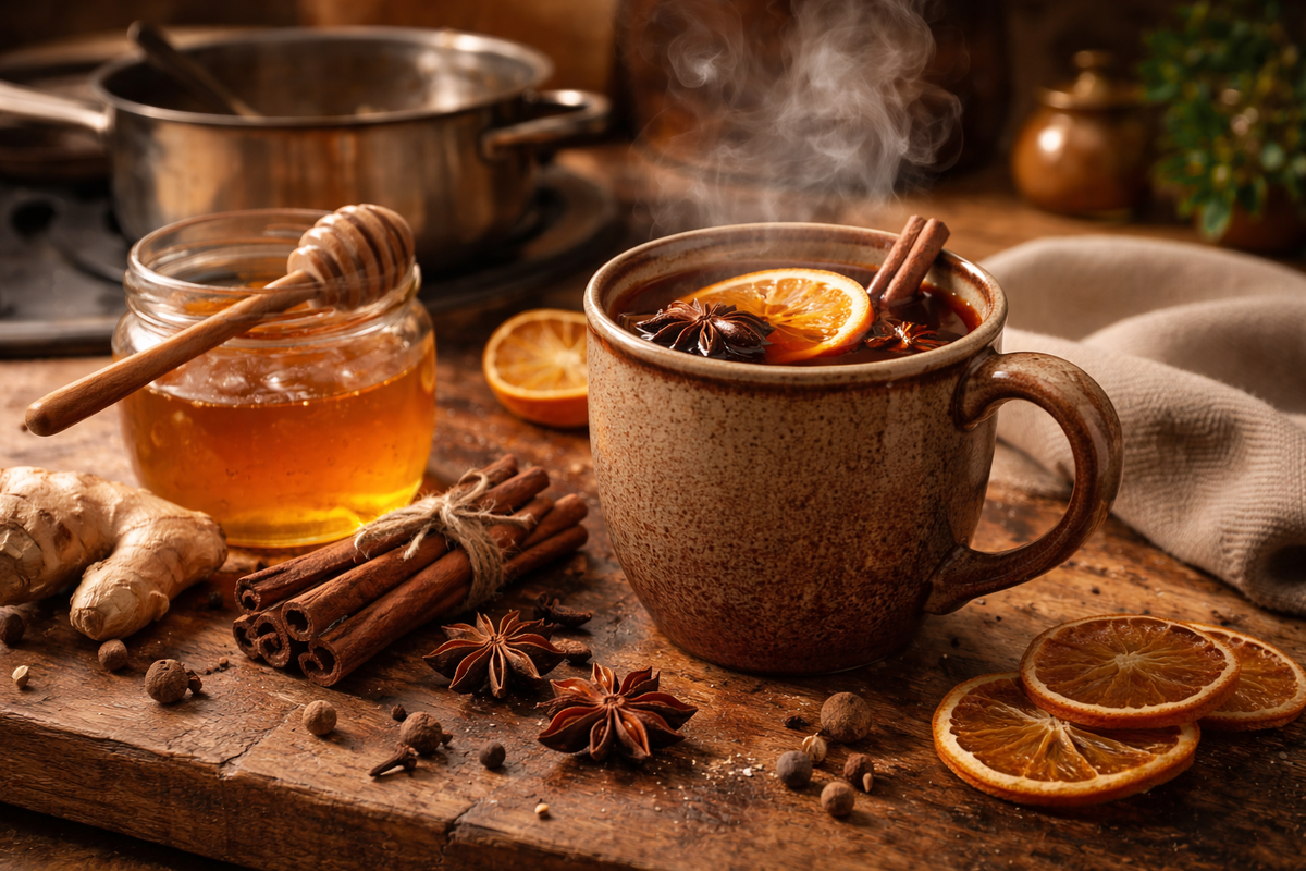 - Ингредиенты: 1 литр воды, 2 столовые ложки меда, палочка корицы, несколько бутонов гвоздики, ломтики свежего имбиря.