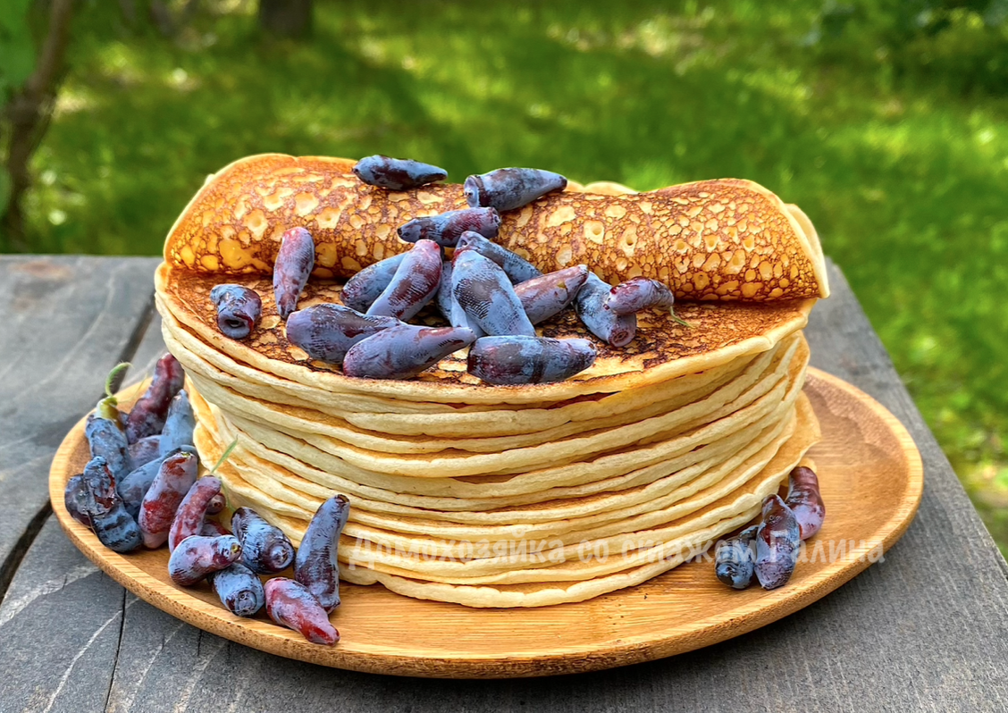 На завершение можно подавать блины с ягодами, например, ягодами жимолости, которые подчеркивают их вкус и делают десерт еще более привлекательным. Летнее угощение готово порадовать своих почитателей!