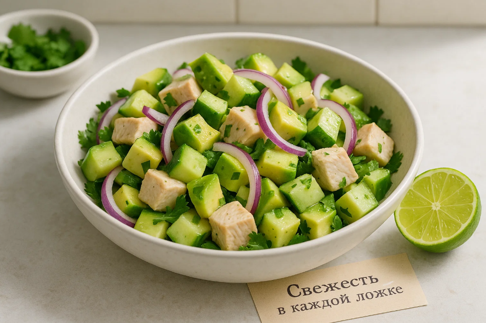 Лаймовый сок — это тот элемент, который делает композицию завершенной. Он добавляет кислинку, убирает излишнюю жирность авокадо и подчеркивает куриный вкус. Благодаря этому этот салат становится не просто полезным, а поистине освежающим и легким.