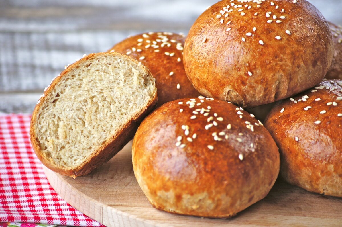 Отделив желток от белка, желток смешивают с 1 ст. л. молока и с помощью кулинарной кисти смазывают им булочки, добавляя кунжут для красоты. Духовку разогревают до 190-200 градусов и выпекают булочки около 25-30 минут до золотистой корочки.