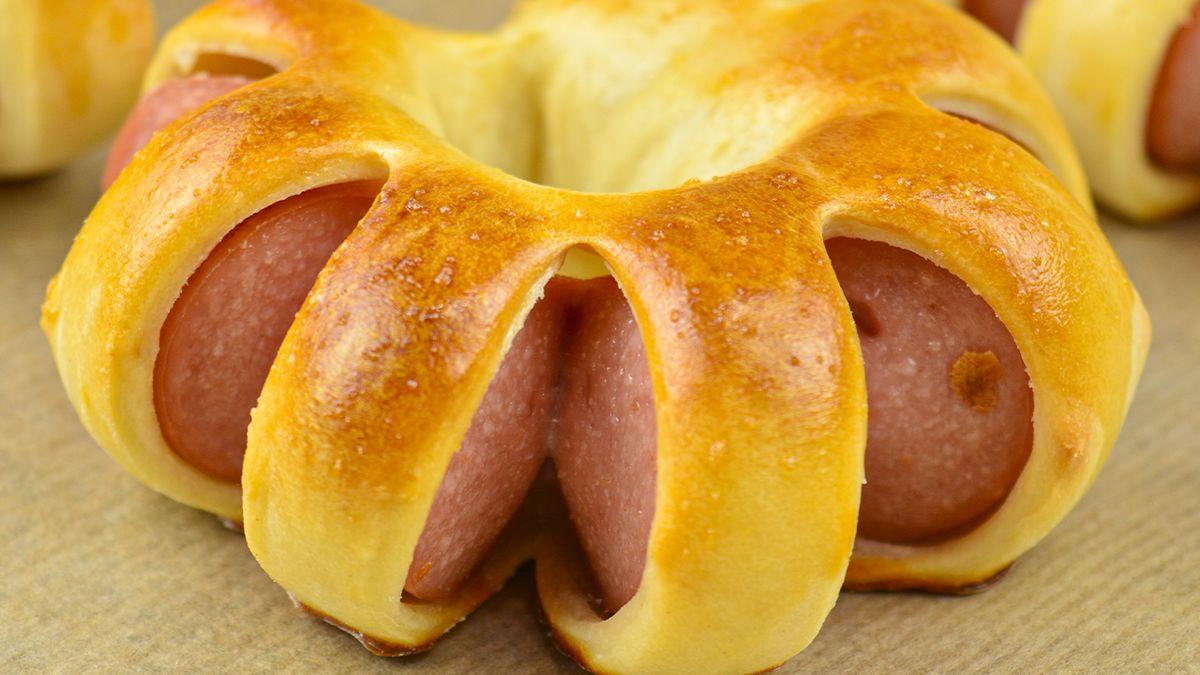 На раскатанное тесто выложите сосиски, разделяя его на порции. В зависимости от длины сосисок количество готовых булочек может варьироваться — в среднем получится около 12 штук.