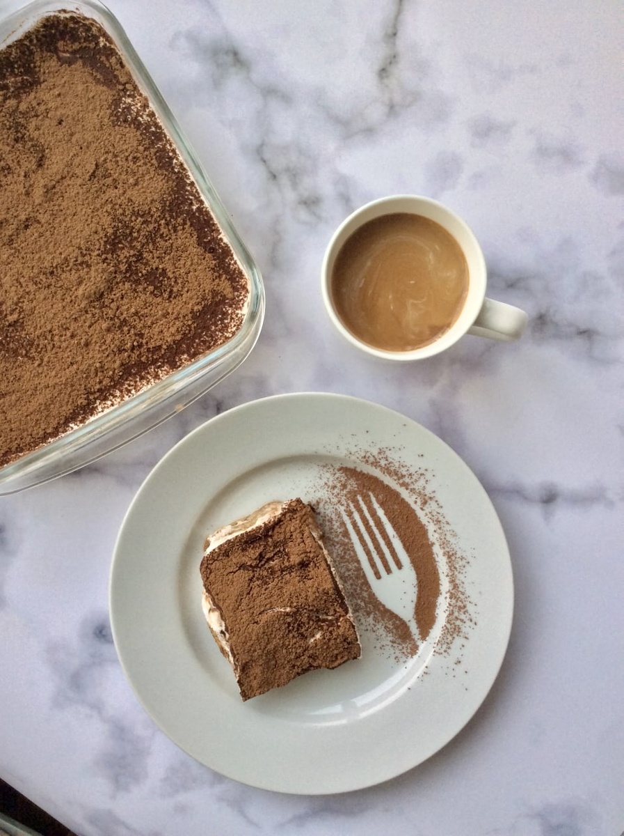 3. Сборка десерта: Повторяем процесс с печеньем и кремом, пока не закончится масса. Верхняя часть должна быть покрыта оставшимся кремом. Затем посыпаем десерт какао через сито. Убираем в холодильник на 1–2 часа, а лучше на ночь, чтобы десерт настоялся и стал еще более нежным.