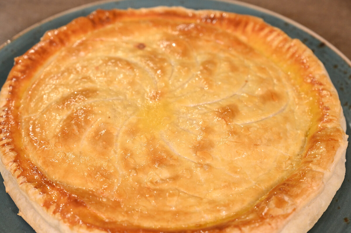 Сыр натирается на крупной терке, а молоко доводится до кипения. Снимая с плиты, постепенно добавляется натертый сыр, перемешивая до полного расплавления.В небольшой миске смешивается мука с одной столовой ложкой молока или воды. Когда сыр растворится, эта мучная паста добавляется в кастрюлю, тщательно перемешивается и приправляется белым перцем.Полученная смесь выкладывается в форму, предварительно застеленную пленкой, и отправляется в холодильник на 2 часа для застывания.Духовка разогревается до 220 градусов.Ветчина нарезается крупными кусками.Тесто раскатывается, из него вырезаются два круга диаметром 23 см.Первый круг помещается на противень с пергаментом и смазывается горчицей. Ветчина и охлажденный сыр выкладываются на горчицу.Края теста смачиваются яйцом, накрывается вторым кругом, удаляется воздух, края обрезаются, формируется узор с помощью вилки.Тесто вновь смазывается яйцом и убирается в холодильник на 10 минут. Сверху можно сделать узор и еще раз смазать яйцом.Галета запекается: сначала 10 минут при 220 градусах, затем 20 минут при 180 градусах. После готовности её можно подавать, предварительно немного остудив.Приятного аппетита!