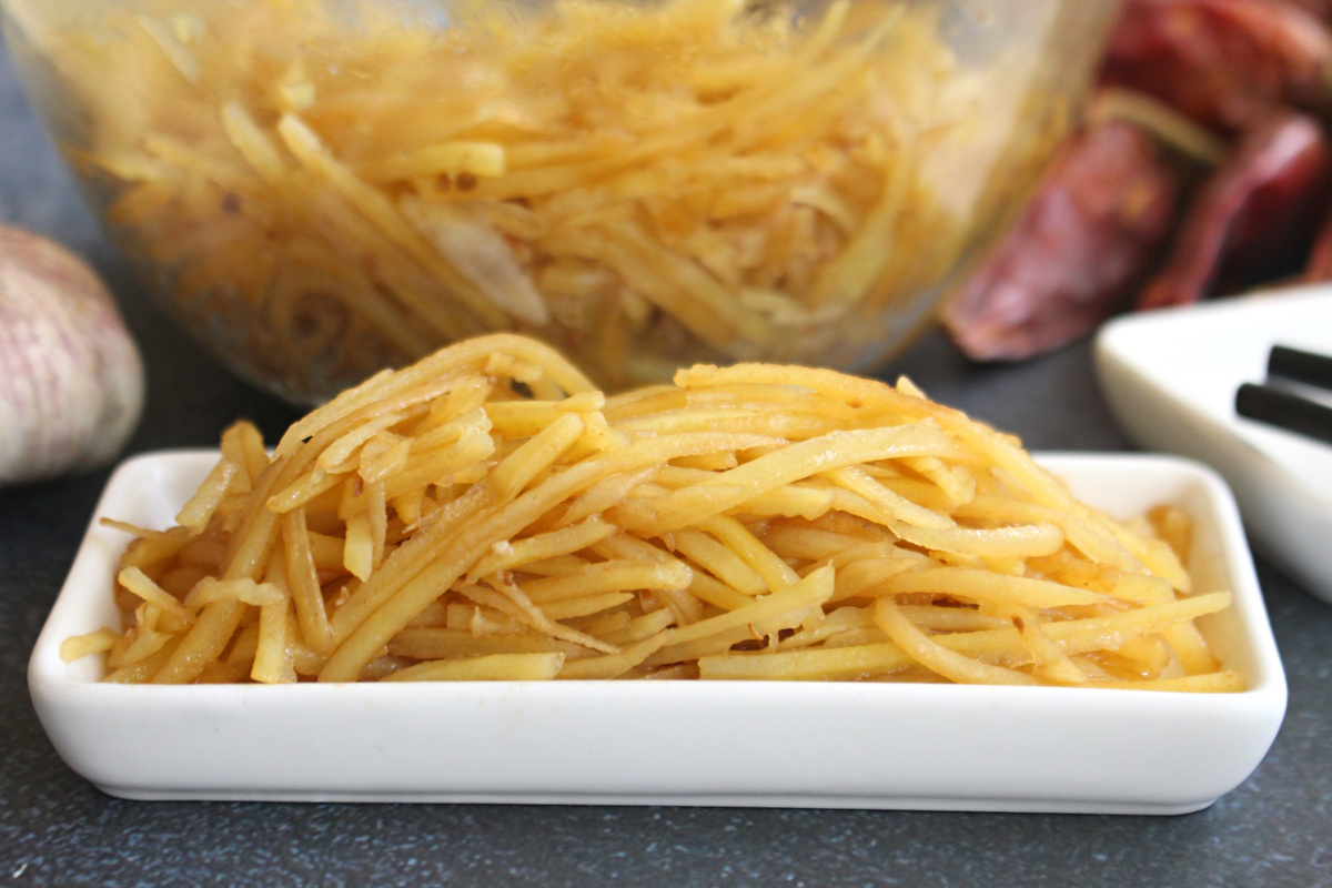 Переложите готовую картошку в салатник. Туда же добавьте кориандр и через пресс выдавите чеснок. Введите сахар, а затем разогрейте растительное масло до горячего состояния и аккуратно вылейте на чеснок — должно получиться шипение.