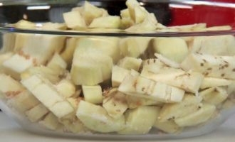 Приготовление занимает всего 40 минут, а сам процесс довольно прост. Начните с очищения баклажанов от кожицы и нарезания их на небольшие дольки. Щедро посолите их и тщательно перемешайте руками, после чего оставьте на некоторое время в холодной воде. Это позволит избавиться от горечи.
