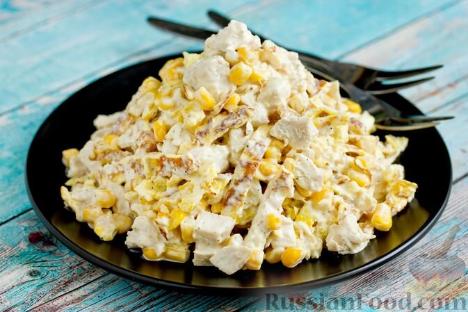 Салат с курицей и кукурузой. Простота приготовления и мягкий вкус – главные преимущества этого блюда. Комбинация куриного филе, кукурузы и яичных блинчиков делает его идеальным выбором для тех, кто ценит легкость и питательность.