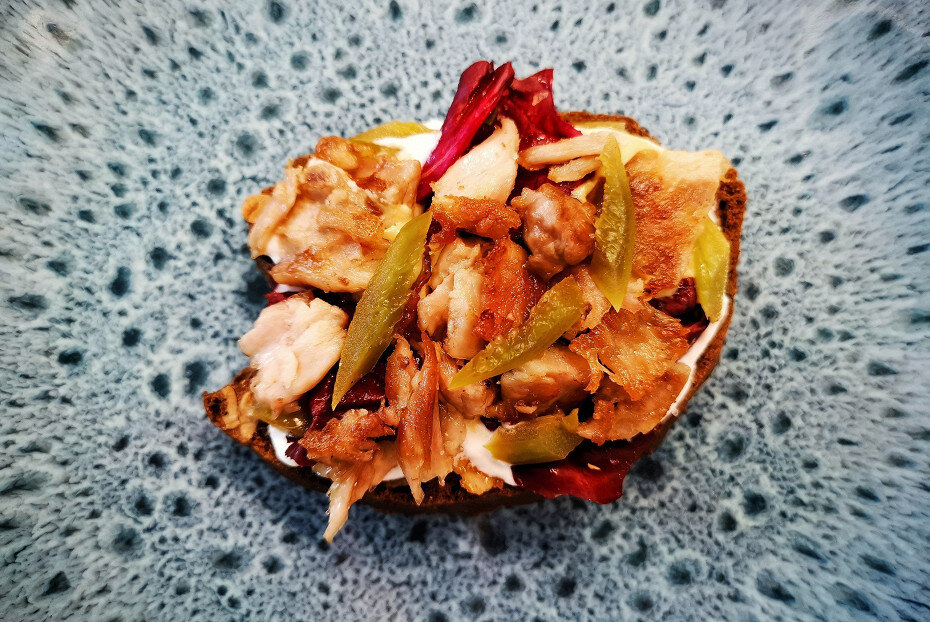 Нарезать хлеб: отрезать от черного хлеба кусок толщиной около 1,5 см и подсушить его в тостере до легкой хрустящей корочки.Обжарить свинину: в сковороде разогреть горчичное масло, добавить мелко нарезанную свинину, посолить и уменьшить огонь до среднего. Обжаривать мясо до появления золотистой корочки.Собрать брускетту: смазать подсушенный хлеб творожным сыром, затем добавить дижонскую горчицу. Выложить сверху листья салата, затем горячую свинину. Украсить мелко нарезанным халапеньо.Эта брускетта станет великолепной закуской для вечеринки или быстрым перекусом в течение дня. Вкусное сочетание хрустящего хлеба, сливочного сыра и пряной свинины никого не оставит равнодушным!