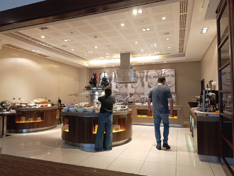 Отельный ресторан, где проходит завтрак, расположен всего в нескольких шагах от номера. Просторное и уютное помещение наполняется постояльцами, среди которых много иностранцев.