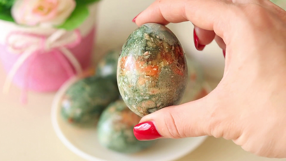 4. Когда яйца будут готовы, аккуратно снимите бинт и шелуху. Чтобы придать им яркость и блеск, протрите ватным диском, смоченным в растительном масле.
