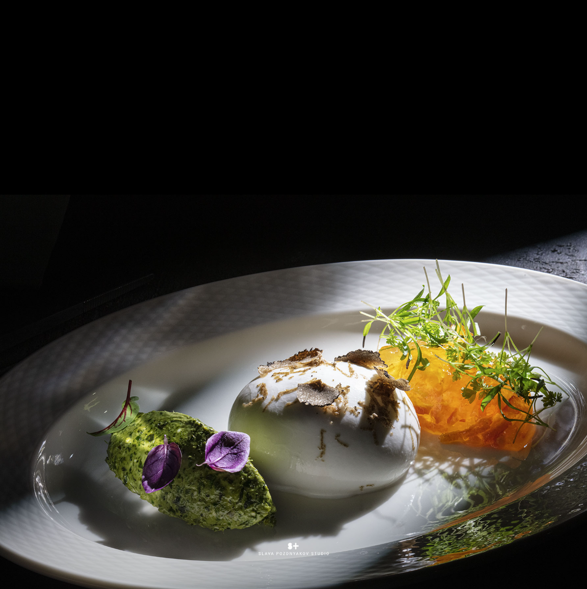 Фуд-стилист и фотограф Слава Поздняков представляет уникальную концепцию фотосъемки, превращая простое отображение еды в театральное искусство. При помощи игры света и тени он создает завораживающую атмосферу, которая мгновенно захватывает внимание зрителя. Каждый кадр действительно оживает, располагаясь на элегантной белой тарелке на фоне глубокого черного цвета, словно находится на сцене.