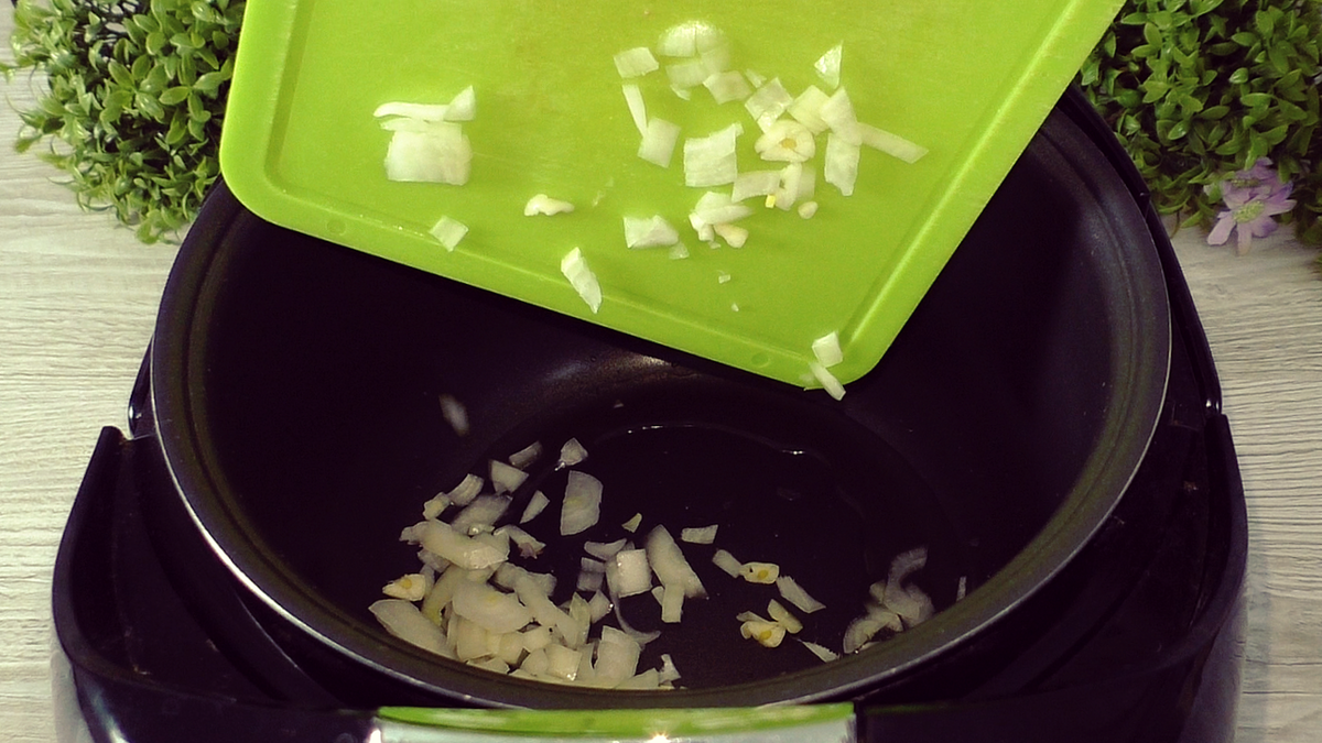 2. После этого добавить мелко нарезанный лук и чеснок, обжаривать около минуты до появления аромата.