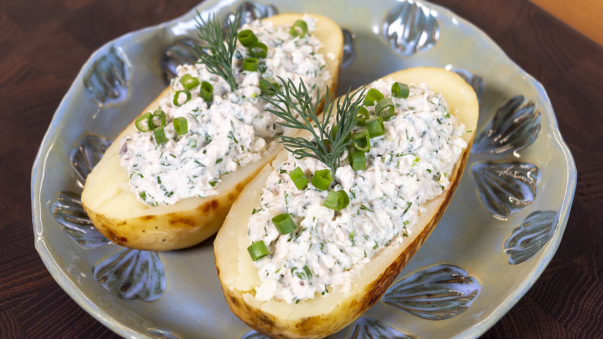 Картофель тщательно моется и солится, затем заворачивается в фольгу. Запекайте в разогретой до 230 градусов духовке на протяжении 30 минут. Пока картофель запекается, займитесь начинкой. В глубокой миске смешайте сметану с сушеным сыром — консистенция должна напоминать творожный сыр. Затем добавьте измельченные кусочки консервированного тунца, нарезанный перчик халапеньо и стертую до пастообразного состояния чесночную дольку. Все тщательно перемешайте, разминая кусочки тунца.