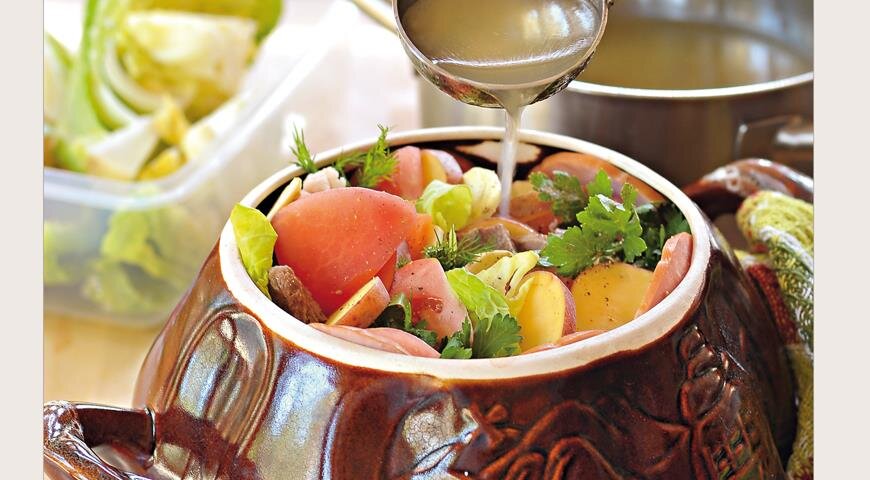 Поместить мясо в кастрюлю, залить 2 литрами холодной воды. Довести до кипения на небольшом огне, снять пенку и варить без крышки в течение 1 часа, не допуская бурного кипения. Готовое мясо вынуть, нарезать кусочками, а бульон процедить.Очистить морковь, репу, петрушку и сельдерей. Нарезать овощи крупными дольками. Удалить верхние вялые листья с капусты, не вырезая кочерыжку, и разрезать на 5–7 частей.На сковороде разогреть топленое масло (4-6 ст. ложек). В обливной горшок выложить сначала ломтики ветчины, затем нарезанное мясо и овощи, чередуя слои. Каждый слой приправить солью, перцем и сбрызнуть маслом. Добавить целые пучки зелени между слоями.Обдать помидоры кипящей водой, затем охладить и очистить от кожицы. Разрезать их на 8 частей, удалив семена. Выложить помидоры сверху, затем нарезанный кружками картофель, полить маслом и посолить.Осторожно влить в горшок немного остывший бульон, плотно закрыть крышкой. Поместить в предварительно разогретую до 160 °C духовку на 1.5 часа. Подавать горячим.Подписывайте на наш канал в Дзене!