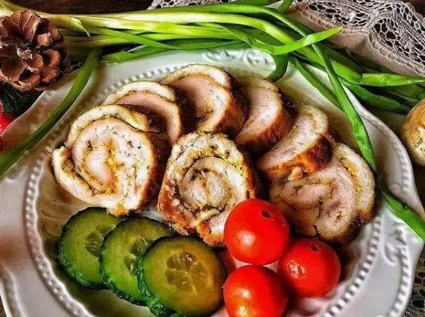 Готовый рулет можно подавать как горячим, так и в холодном виде. Он отлично сочетается с маринованными огурцами или другими свежими овощами, что делает его идеальным блюдом для любого стола.