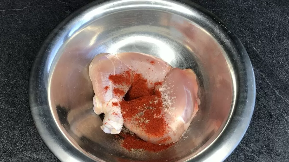 Процесс начинается с подготовки куриного мяса. Хорошо промытые окорочка следует обсушить, добавить приправы: соль, перец, паприку и сушеный чеснок, а также томатную пасту с майонезом. После этого смесь оставляется на 20 минут для маринования.