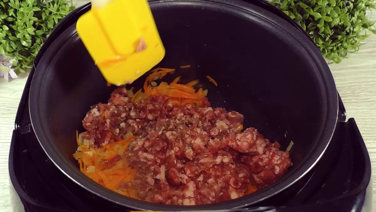 После этого пора добавлять мясной фарш. Готовить на том же режиме 3-4 минуты до изменения его цвета. Не забудьте добавить томатную пасту и столовый соус. Все хорошо перемешать и жарить еще 1-2 минуты.