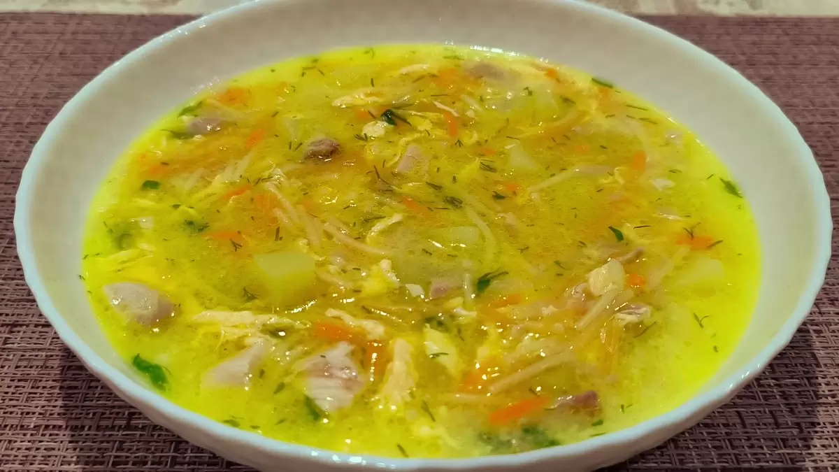 В отдельной емкости яйца нужно смешать с молоком, посолить и поперчить. Затем, аккуратно перемешивая, тонкой струйкой влить яичную массу в кипящий суп. Это придаст ему мягкость и сливочный вкус. Далее добавляем предварительно подсушенную вермишель, которая сохранит свою форму даже после нескольких дней хранения.