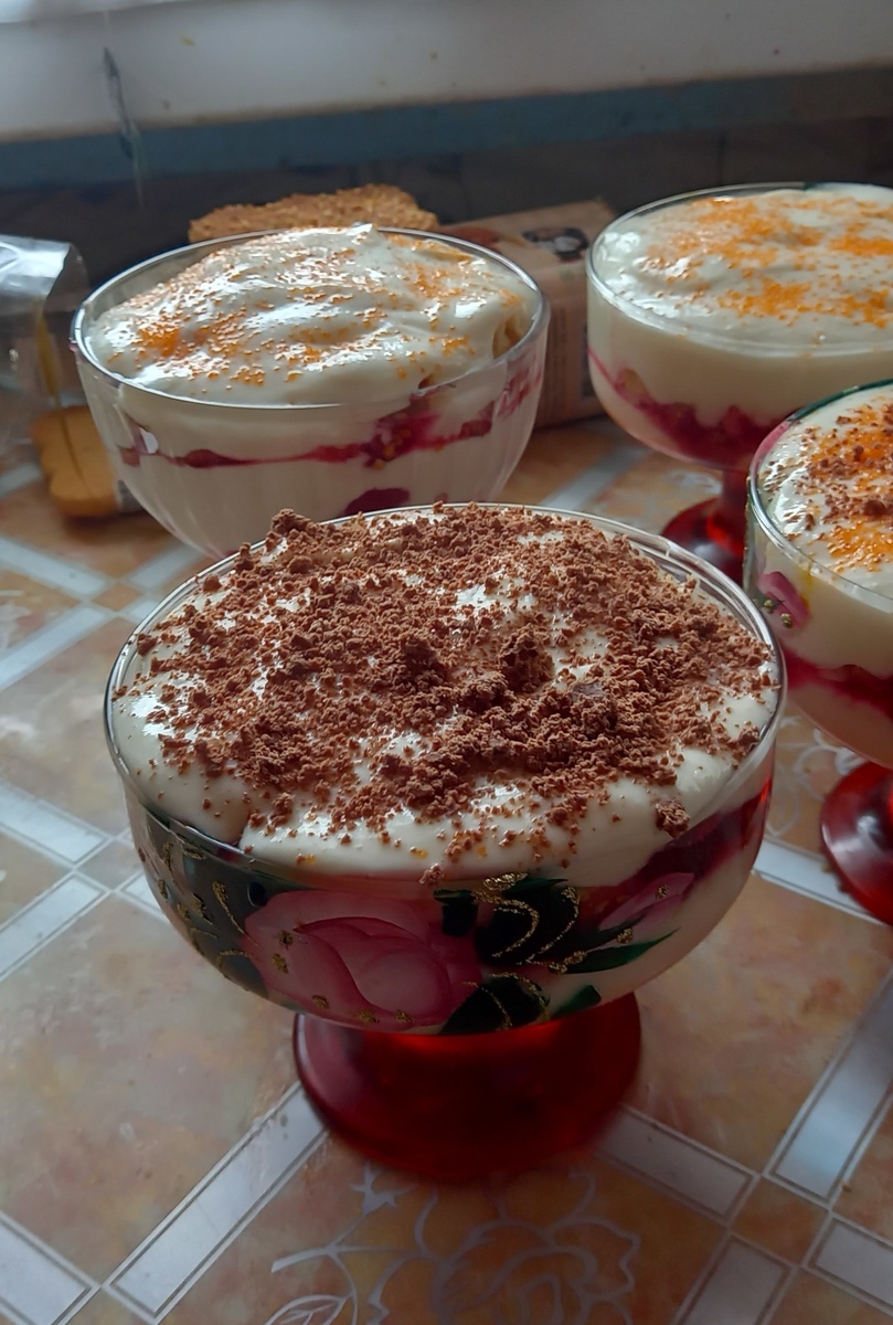 Тем временем творожная масса создается буквально в несколько шагов: все ингредиенты взбиваются до получения однородной и воздушной консистенции. Далее, процесс сборки десерта начинается с крошения печенья на дно креманки, которое затем поливается остывшим вишневым сиропом.