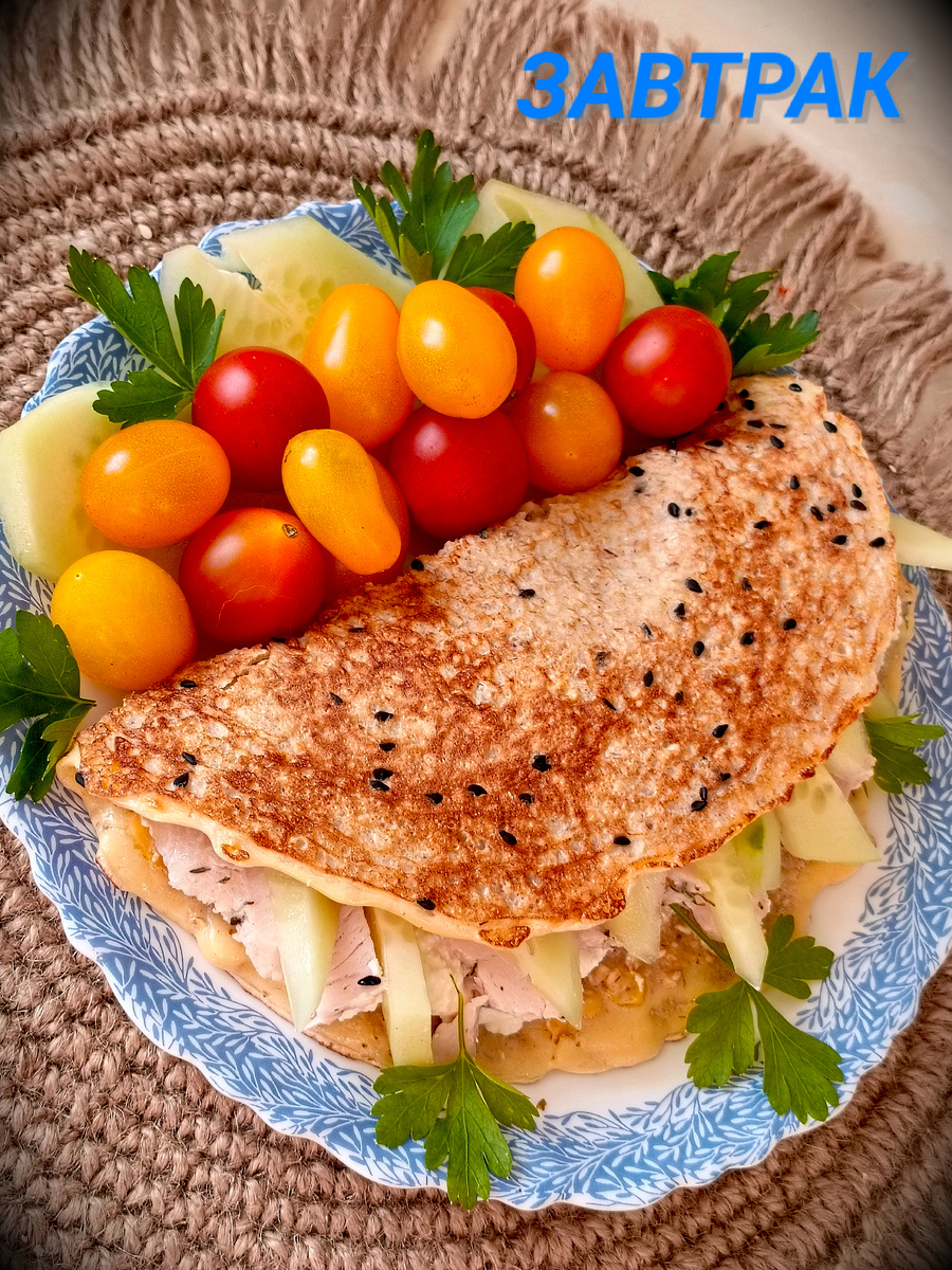 Когда одна сторона овсяноблина готова, его следует смазать творожным сыром. Далее добавляется отварная куриная грудка, которая останется сочной благодаря хранению в бульоне. Добавьте свежий огурец, сложите овсяноблин пополам и не забудьте положить помидоры и зелень для полного вкусового ансамбля.